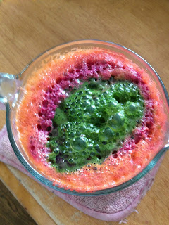 Drinking the colors of the rainbow. Isn't it pretty? For this recipe I juiced beets, carrots, apples, cucumbers, lemons, pears, ginger, and spinach. A tip - adding lemons is key in being able to enjoy this mixture. Otherwise, when juicing beets one gets the idea you are eating dirt! The lemons mask it well.